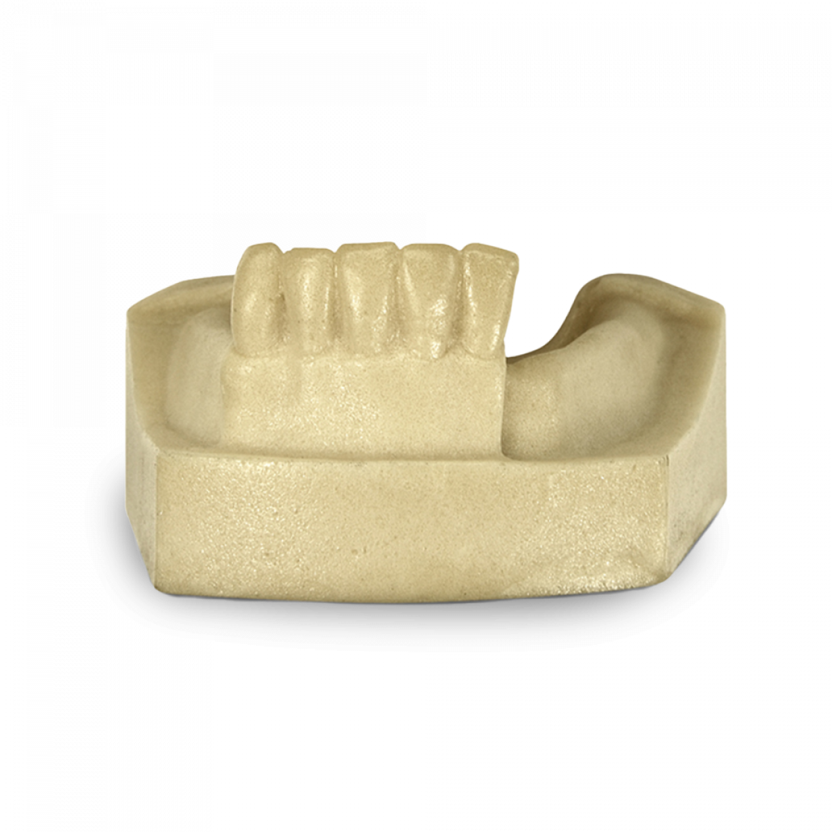 Com propriedades mecânicas semelhantes ao osso humano (tipo 2) e anatomia detalhada, permite perfurações, preparo de leito, instalação de implantes e etapas protéticas usando instrumentais reais. O modelo possui presença dos dentes 31, 32, 41, 42 e 43, criando cenários objetivos para planejamento, execução e repetição do treino