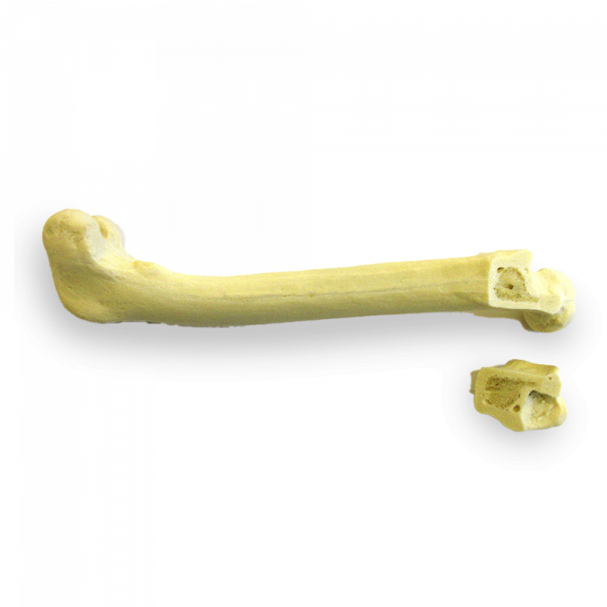 Fabricado em poliuretano rígido, com cortical externa, estrutura esponjosa e canal medular funcional, o modelo suporta perfurações, cortes e múltiplas manipulações, garantindo treinamento seguro, repetitivo e alinhado às boas práticas de bioética e sustentabilidade.