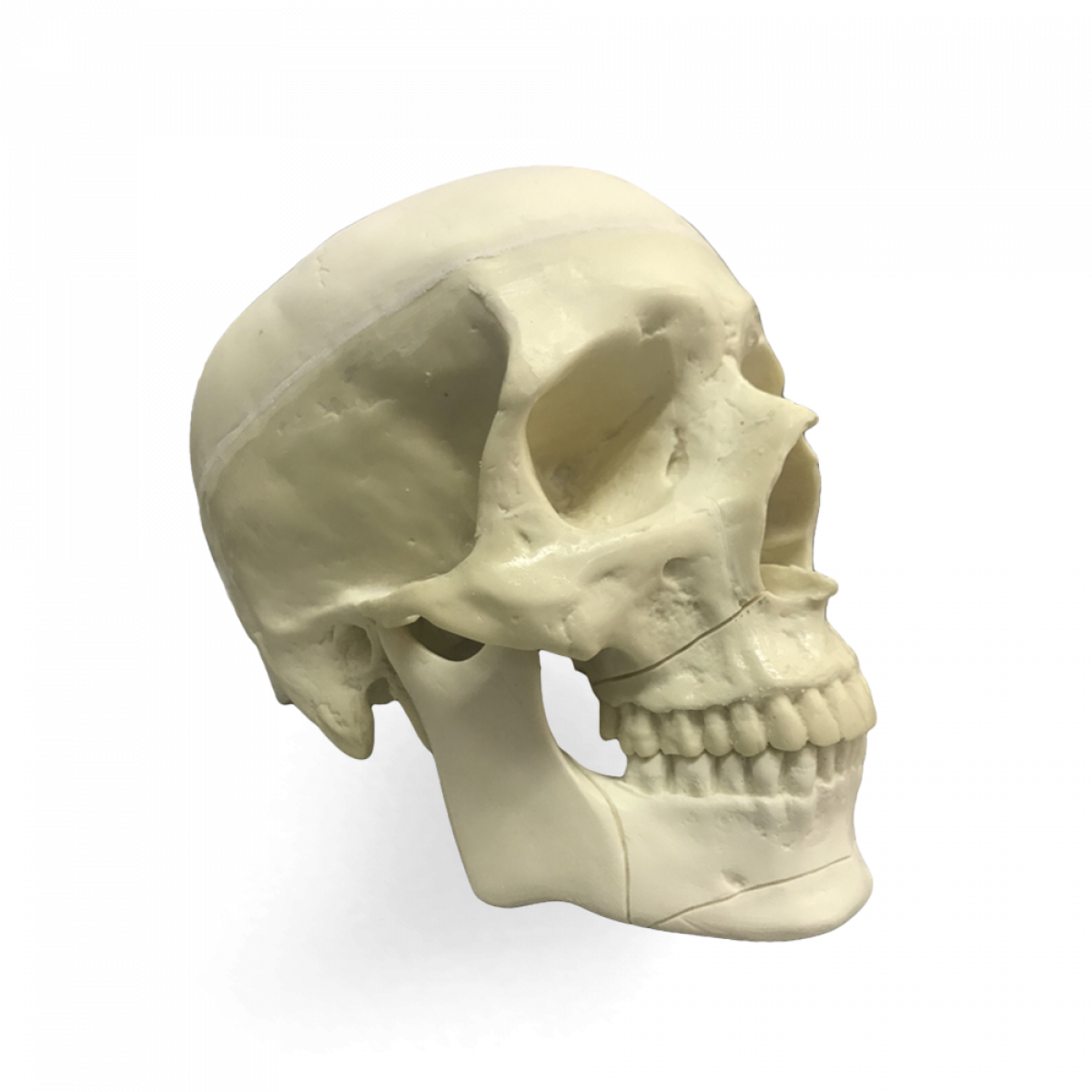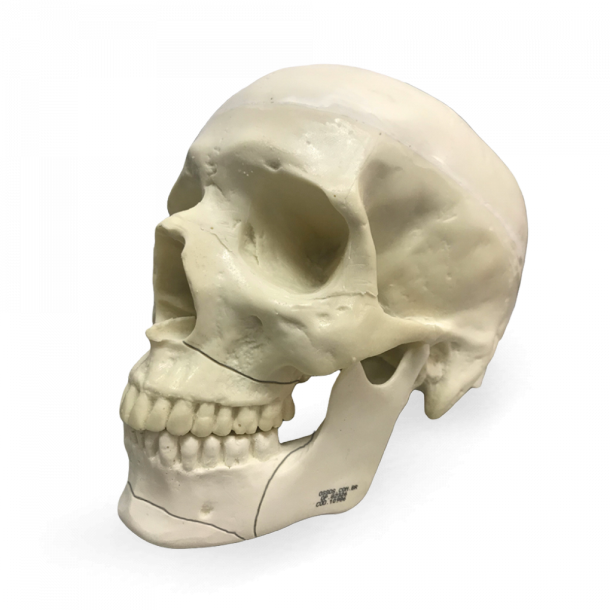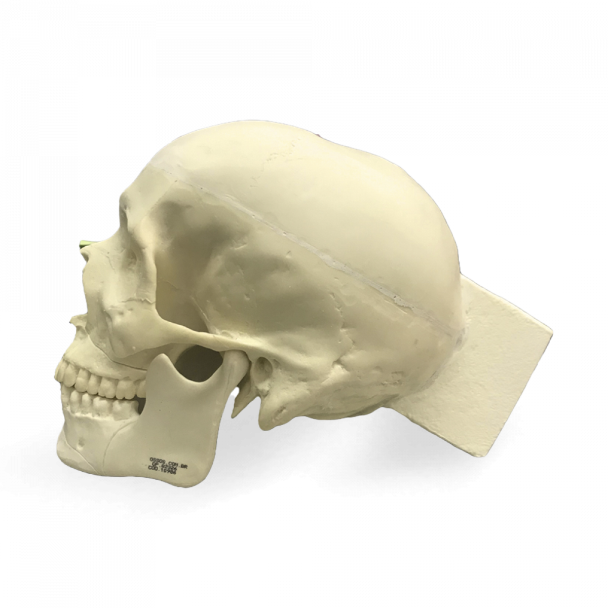 Fabricado com propriedades mecânicas semelhantes ao osso humano, o crânio suporta cortes, perfurações e fixação com placas e parafusos, simulando as resistências encontradas em uma cirurgia real. A marcação das fraturas Le Fort e da fratura sagital de mandíbula facilita o planejamento cirúrgico passo a passo, reforçando o raciocínio tridimensional do aluno.