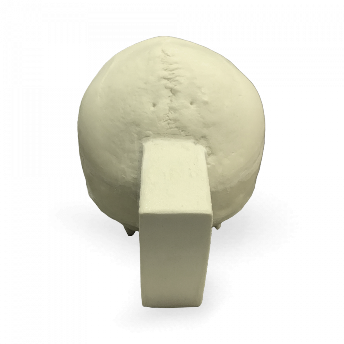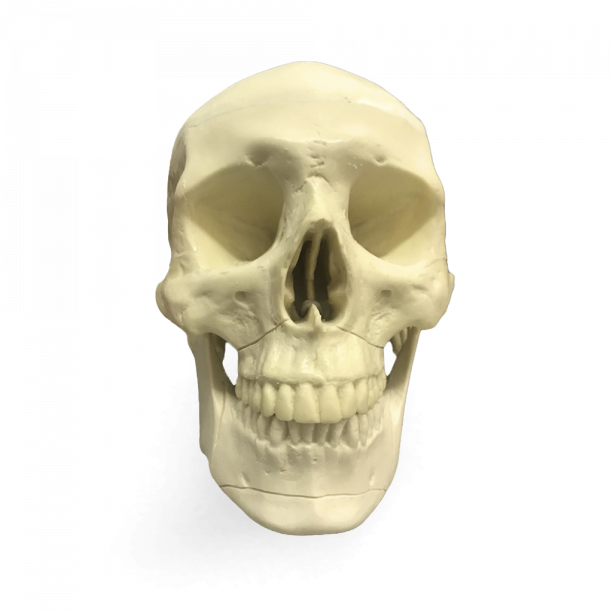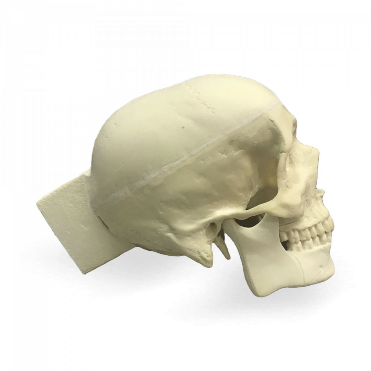 Fabricado com propriedades mecânicas semelhantes ao osso humano, o crânio suporta cortes, perfurações e fixação com placas e parafusos, simulando as resistências encontradas em uma cirurgia real. A marcação das fraturas Le Fort e da fratura sagital de mandíbula facilita o planejamento cirúrgico passo a passo, reforçando o raciocínio tridimensional do aluno.